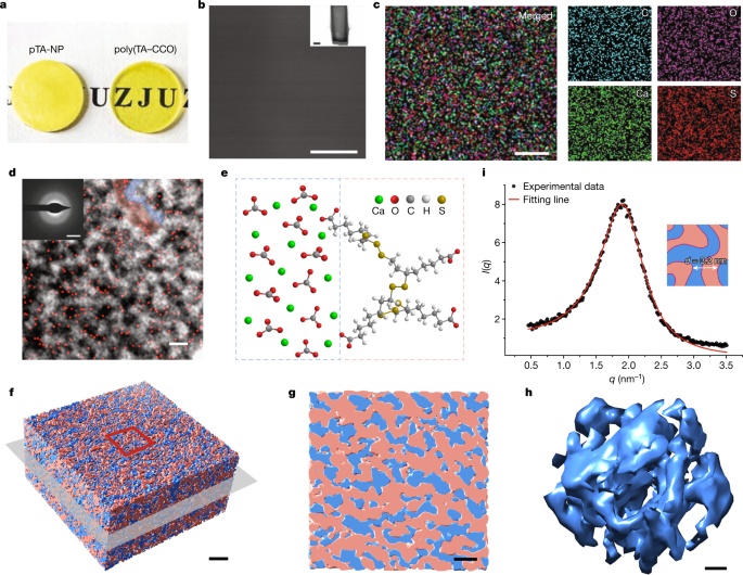 作者使用熱壓(120°C,110MPa)來(lái)啟動(dòng)TA-CCO雜化分子的交聯(lián)和聚合過(guò)程,由此產(chǎn)生的透明聚(TA-CCO)塊,該聚(TA-CCO)塊體從宏觀到微觀尺度的連續(xù)結(jié)構(gòu),元素C、O、Ca和S均勻分散在聚(TA-CCO)塊體中。這種均勻的結(jié)構(gòu)表明,由于有機(jī)和無(wú)機(jī)部分之間的靜電相互作用,在材料形成過(guò)程中避免了有機(jī)相或無(wú)機(jī)相的單獨(dú)成核。
