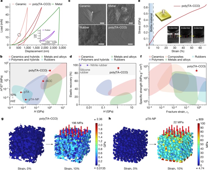 由于共價(jià)-離子雙連續(xù)網(wǎng)絡(luò)的存在,聚(TA-CCO)表現(xiàn)出矛盾的力學(xué):陶瓷般的硬度和強(qiáng)度以及橡膠的變形性和彈性。其強(qiáng)度與大多數(shù)陶瓷相當(dāng),遠(yuǎn)高于橡膠和商業(yè)聚合物。. 聚(TA-CCO)將陶瓷的高強(qiáng)度與橡膠的高回彈性和斷裂應(yīng)變相結(jié)合,形成了一種“彈性陶瓷材料”。