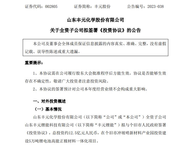此前豐元股份在2023年一季度報中表示,擬與云南省玉溪市華寧縣人民政府簽署《投資協議》,總投資約25億元,在華寧縣產業園區盤溪化工園區投資建設20萬噸磷酸鐵一體化項目及10萬噸草酸暨黃磷尾氣綜合利用項目;公司全資子公司豐元鋰能在玉溪市投資建設20萬噸鋰電池高能正極材料及配套相關項目的二期項目:年產10萬噸磷酸鐵鋰正極材料,該二期項目選址位于玉溪市紅塔工業園區,占地面積不超過247畝,投資金額不超過人民幣20億元(一期項目年產5萬噸磷酸鐵鋰正極材料項目已進入試生產階段)。