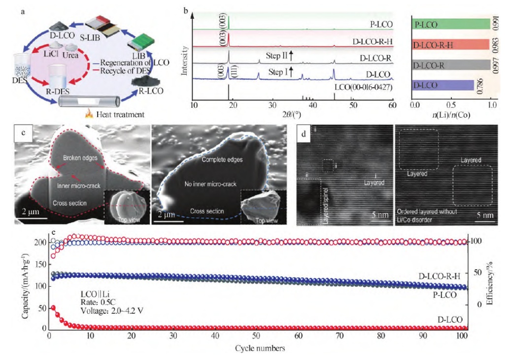 (a)DES直接回收過程示意圖;(b)LCO正極XRD譜圖;(c)失效和修復后LCO正極FIB-SEM圖;(d)失效和修復后LCO正極TEM照片;(e)不同LCO在0.5C下的循環性能圖(來源:WANG Junxiong,et al,《Direct and green repairing of degraded LiCoO2 for reuse in lithium-ion batteries)