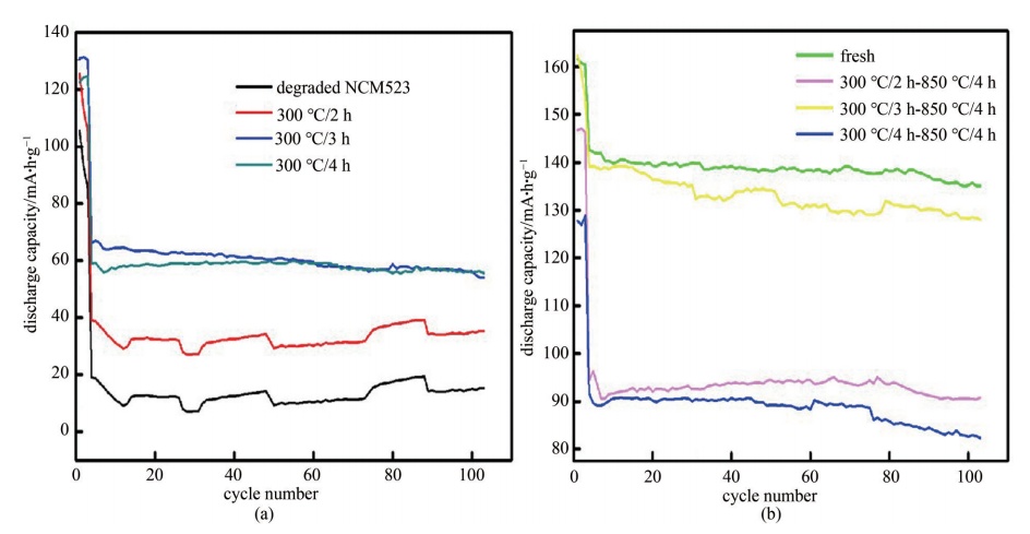 樓平等在空氣氣氛中,采用低共晶熔鹽混合物LiNO3-LiOH為鋰鹽進行補鋰修復再生,從而將廢舊NCM523重新修復成初始充電比容量的材料。其電化學結果如下圖所示,在0.1C的充放電電流密度和2.8~4.25V 的電壓范圍內,300℃/3h~850℃/4h修復再生后的NCM523首次放電比容量為161.2mAh/g,充放電庫侖效率為87.8%,1C條件下循環100次后,放電比容量為132.6mAh/g,相較于未處理的廢棄三元正極材料,倍率性能和循環性能得到了大幅提升,與商業 NCM523材料相差無幾。