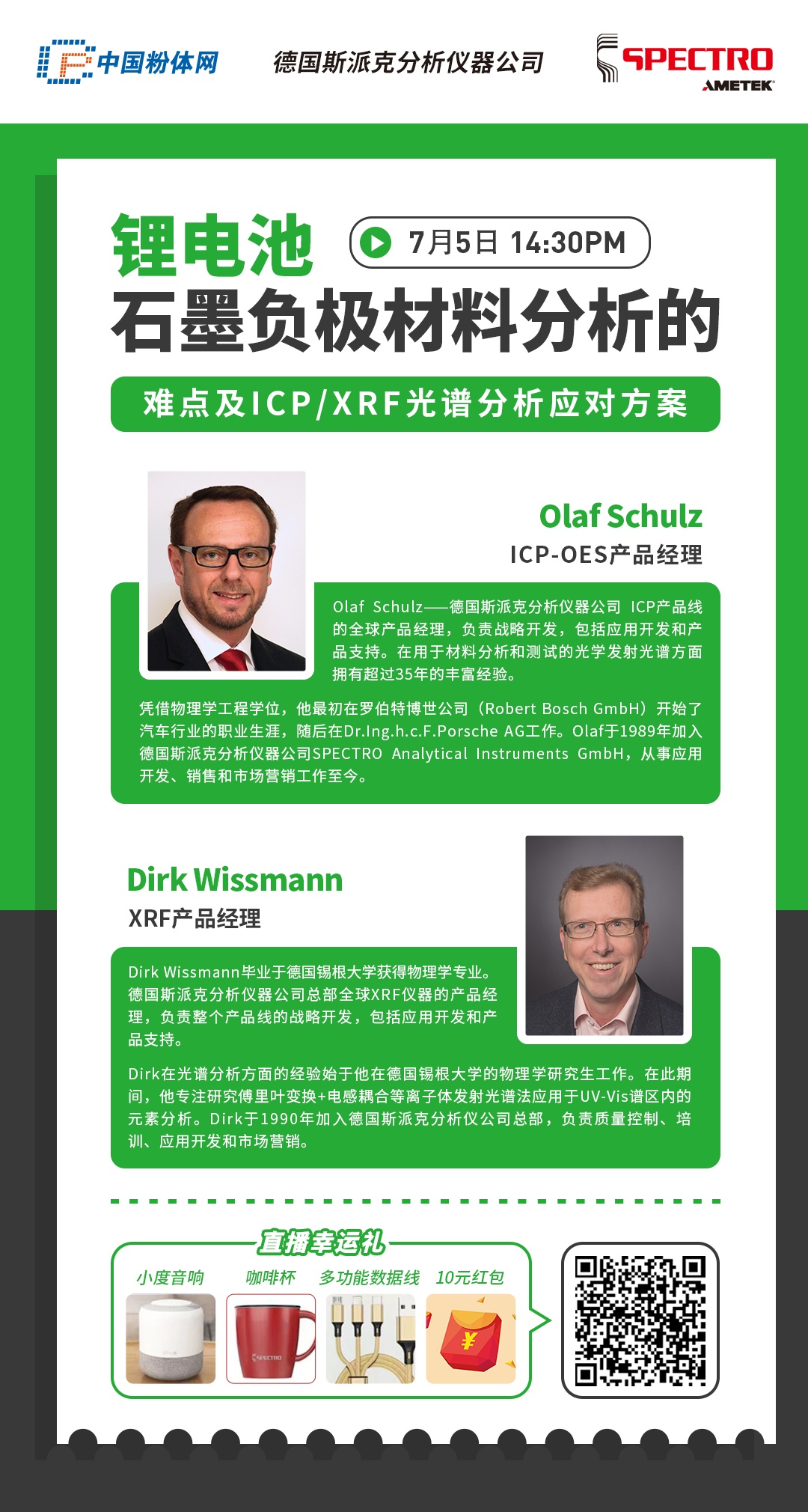 中國(guó)粉體網(wǎng)訊 中國(guó)粉體網(wǎng)聯(lián)合德國(guó)斯派克分析儀器公司主辦的鋰電池石墨負(fù)極材料分析的難點(diǎn)及ICP/XRF光譜分析應(yīng)對(duì)方案網(wǎng)絡(luò)直播課將于7月5號(hào)下午2點(diǎn)半在線直播,歡迎預(yù)約觀看!