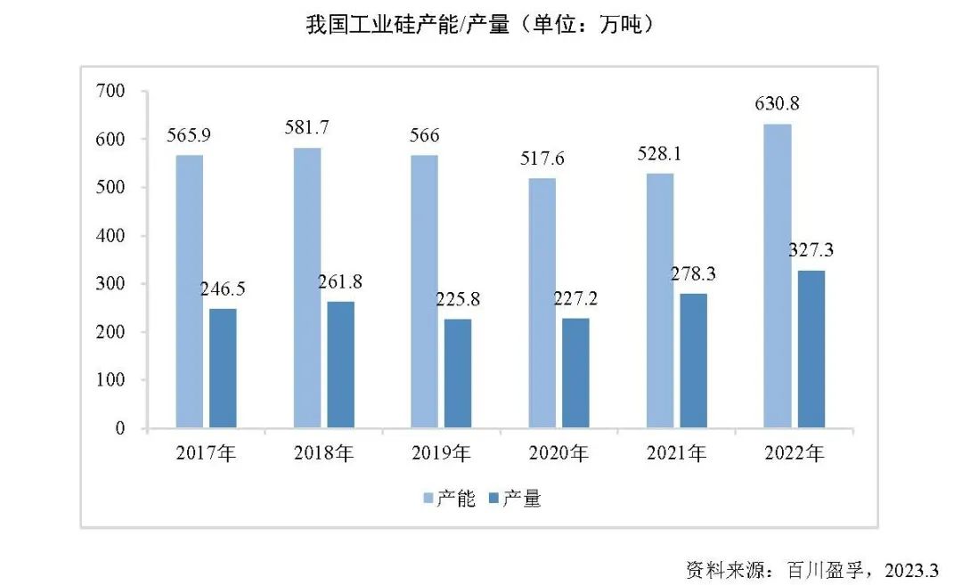 2022年,我國工業硅總產能達630.8萬噸,同比增加19.45%,產量約327.3萬噸,同比增加17.60%。由于2022年工業硅市場行情整體較好,部分閑置產能重新投產,疊加部分新增產能投產,導致國內總產能有較大幅度增長。同時廠家生產積極性較高,尤其上半年枯水期,西南地區開工率保持相對高位,盡管下半年因電力短缺以及疫情影響,全年工業硅產量依然有較大幅度增加。