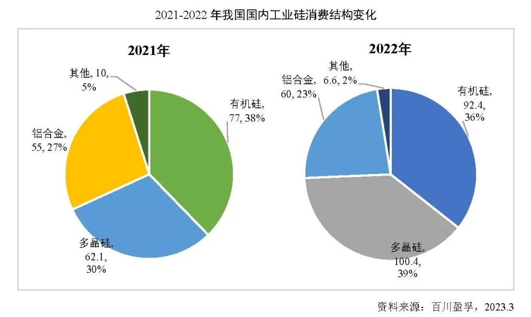 工業硅下游需求中,多晶硅、有機硅以及鋁合金領域對工業硅消耗較大。其中,2022年,多晶硅消耗工業硅達到100.4萬噸,超越有機硅成為第一消費領域,占比39%,較2021年上升9個百分點;有機硅消耗工業硅92.4萬噸,占比36%,下降2個百分點;鋁合金消耗工業硅60萬噸,占比23%,下降4個百分點。