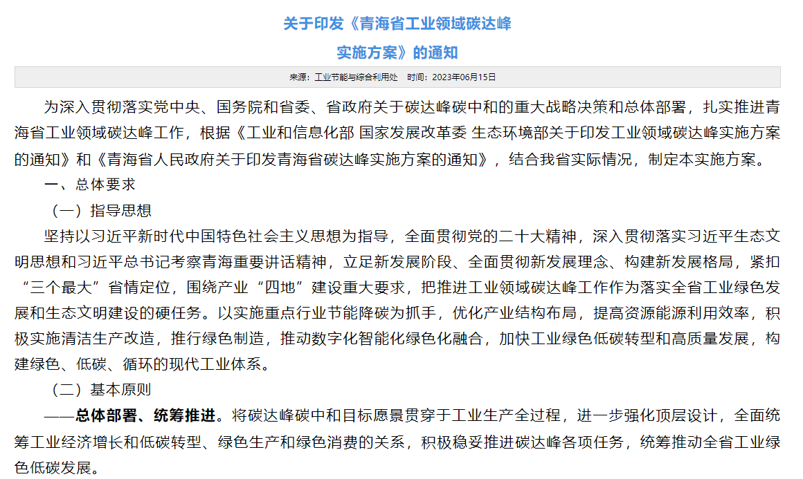中國粉體網訊 6月15日,青海省工信廳印發《青海省工業領域碳達峰實施方案》。