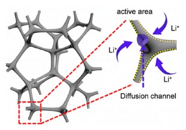 關(guān)于調(diào)控石墨負(fù)極結(jié)構(gòu),研究人員采用化學(xué)氣相沉積(CVD)方法,得到了高度支化的氮摻雜石墨(BNG)管狀泡沫負(fù)極(圖1)。優(yōu)化后的C–N鍵作為活性原子域,激發(fā)Li+擴(kuò)散,將相對惰性的初始碳材料轉(zhuǎn)化為活性材料,實現(xiàn)低溫循環(huán)下鋰離子在材料中的可逆脫嵌,引入的氮原子擴(kuò)大了石墨材料的層間距,改善了Li+在低溫下的擴(kuò)散動力學(xué),在-10℃下,獲得了良好的可逆容量和循環(huán)穩(wěn)定性。同樣為了縮短Li+擴(kuò)散路徑,也有研究者開發(fā)了由具有通孔的薄石墨片和碳納米管組成的電極。該通孔使鋰離子可以在層與層之間傳輸,有效地縮短了鋰離子擴(kuò)散路徑;碳納米管可以有效防止石墨片的重疊,結(jié)合低去溶劑化能電解質(zhì),促進(jìn)鋰離子在電極/電解液界面的傳輸。制備的電池具有優(yōu)異的低溫性能。