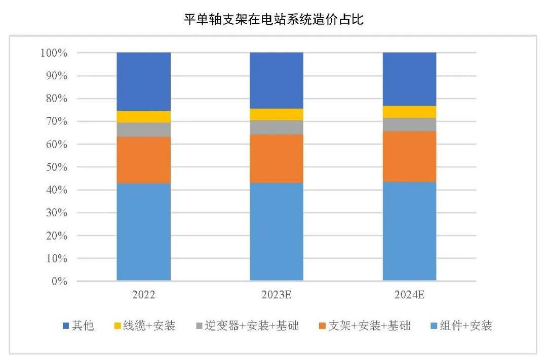 與2022年相比,2023年跟蹤支架在電站系統中的占比將恢復到此前水平,未來,組件價格會呈現逐漸下降的趨勢,而跟蹤支架在光伏電站系統中的成本占比將增長3-5%。從電站系統的國產化占比來說,組件和逆變器均已完成90%以上的國產化率,唯有跟蹤支架仍處于海外廠家占據主要市場的格局。