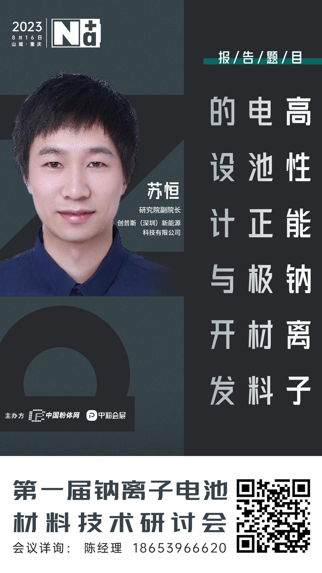 2023年8月,中國粉體網(wǎng)將在山城重慶舉辦“2023先進(jìn)正極材料技術(shù)與產(chǎn)業(yè)高峰論壇暨第一屆鈉離子電池材料技術(shù)研討會(huì)”。我們有幸邀請到創(chuàng)普斯(深圳)新能源科技有限公司鈉電研究院的蘇恒副院長為我們帶來題為《高性能鈉離子電池正極材料的設(shè)計(jì)與開發(fā)》的報(bào)告。
