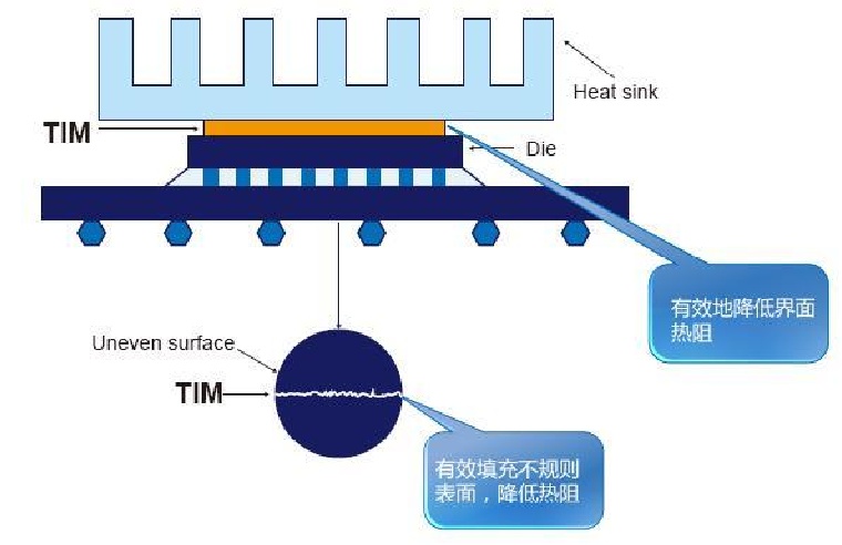 熱界面材料充分地填充了固體表面缺陷之間的界面間隙,有效地排除了空氣,使得產熱元器件與散熱器件之間的接觸更加密切,大大降低了界面接觸熱阻,建立起了高效的熱傳遞通道,從而使得散熱器件的工作效率得到了最大化的提升。