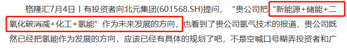 據北元集團回復稱,2023年,公司將開展鹽穴儲能關鍵技術和納米碳酸鈣制備技術研究,加快推進光伏發電+質子膜電解水制氫技術研究,氣液法無汞工藝、高空風能等項目研究應用進度,強化成果轉化,大力推進萬噸級煤化工廢鹽回用電解試驗裝置工藝包設計,把“新能源+儲能+二氧化碳消減+化工+氫能”作為轉型升級新路徑,積極探索綠色發展的新型高質量發展道路。