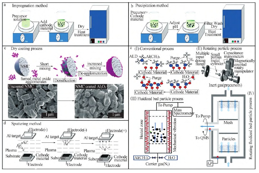 (a)浸漬法(b)沉淀法(c)干法包覆工藝(d)濺射法(e)原子層沉積法