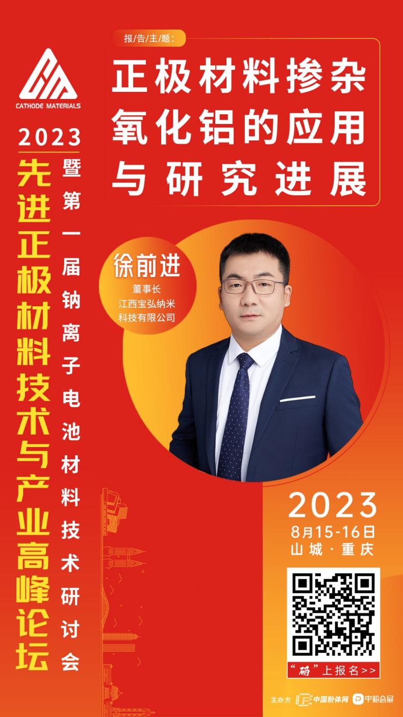 2023年8月,中國(guó)粉體網(wǎng)將在山城重慶舉辦“2023先進(jìn)正極材料技術(shù)與產(chǎn)業(yè)高峰論壇暨第一屆鈉離子電池材料技術(shù)研討會(huì)”。我們有幸邀請(qǐng)到江西寶弘納米科技有限公司的徐前進(jìn)董事長(zhǎng)為我們帶來題為《正極材料摻雜氧化鋁的應(yīng)用與研究進(jìn)展》的報(bào)告。