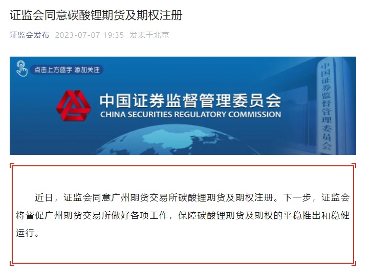 中國(guó)粉體網(wǎng)訊 7月7日,中國(guó)證監(jiān)會(huì)發(fā)布公告顯示,同意廣州期貨交易所(下稱廣期所)碳酸鋰期貨及期權(quán)注冊(cè),要求廣期所做好各項(xiàng)準(zhǔn)備工作,保障碳酸鋰期貨的平穩(wěn)推出和穩(wěn)健運(yùn)行。