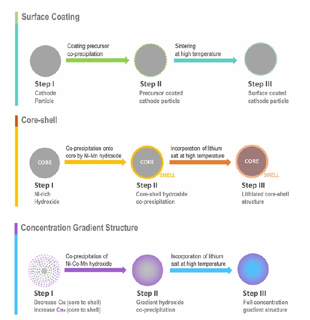 針對上述鎳基層狀正極材料出現的容量以及結構不穩定的問題,目前主要采取體相摻雜、納米涂層、核殼結構和濃度梯度結構等策略。