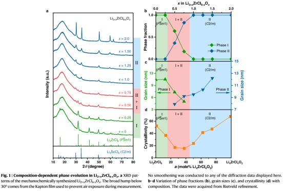 他們首先嘗試通過高能球磨法合成了一系列Li2+xZrCl6-xOx固態電解質;其化學式也可表示為(1-a)Li2ZrCl6-aLi4ZrCl4O2(a=x/2)。X射線衍射表明,x≤0.25的成分展示P3m1結構。隨著x的進一步增加,材料中出現了結構為C2/m的相,并且和P3m1相共存。當x≥1.0時,材料只展示C2/m相。在0.25<x<1.0之間的兩相共存區域,材料的晶體結構尤其容易受到高能球磨破壞,結晶度只有不到20%。由于Zr基氯化物固態電解質通常依賴非晶相實現高效離子傳輸,因此這可能意味著0.25<x<1.0的這些雙結晶相共存的材料具有更高的離子電導率。