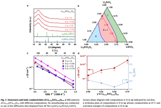 盡管上述材料的離子電導率已超過1mS cm-1,但是仍可進一步提高。根據離子電導率隨著成分的變化趨勢,他們發現當相圖中兩相區的成分接近其與單相區的相界時,離子電導率會獲得提升。為了精確的控制成分,使其接近相界,研究者在上述離子電導率最高的成分Li2.5ZrCl5.5O0.5(即75%Li2ZrCl6-25%Li4ZrCl4O2)的基礎上引入了第三種組分LiZrCl5,從而形成了(75%-y)Li2ZrCl6-25%Li4ZrCl4O2-yLiZrCl5或Li2.5-yZrCl5.5-yO0.5的一系列成分。從X射線衍射結果來看,隨著y的增加,Li2.5-yZrCl5.5-yO0.5 (y≤0.75)中P3m1相的衍射峰強度逐漸增加,而C2/m相的衍射峰強度逐漸減弱。當y=0.75時,盡管P-3m1相和C2/m相仍然共存,但是后者的特征峰變得極其微弱,表明該成分已相當接近相圖中兩相區和單相區的相界。和預期一致,Li2.5-yZrCl5.5-yO0.5的室溫離子電導率隨著y的增加(即成分不斷靠近相圖中單相區和兩相區的相界)而顯著上升。對于最為靠近相界的兩相區成分y=0.75(化學式:Li1.75ZrCl4.75O0.5),材料在25℃的離子電導率達到了2.42mS cm-1,超越了基于昂貴原材料的Li3InCl6、Li2In1/3Sc1/3Cl4等固態電解質。