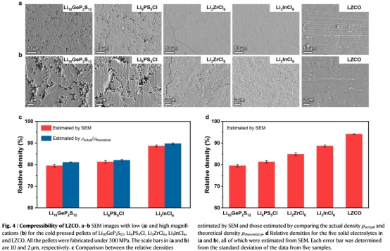 LZCO在室溫下表現出高達2.42 mS cm-1的離子電導率,超過了大多數氯化物固態電解質,即便和硫化物固態電解質相比也并不遜色。與此同時,該材料還具有良好的可變形性,在300 MPa冷壓之后的相對密度高達94.2%,超過了目前常見的以良好可變形性著稱的Li10GeP2S12、Li6PS5Cl、Li2ZrCl6、Li3InCl6等固態電解質。除此之外,由于作為原料的LiCl、LiOH·H2O、ZrCl4價格低廉,LZCO的原材料成本僅$11.6/kg,遠低于$50/kg這一確保固態電池市場競爭力的門檻。
