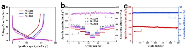 如圖2所示,有研究者在1200℃下一步熱解無煙煤,制備了無煙煤基炭材料,在0.03A/g電流密度下具有222mAh/g的可逆比容量和穩定的儲鈉循環性能,并已將其應用于低速電動車,實現規模化制備。
