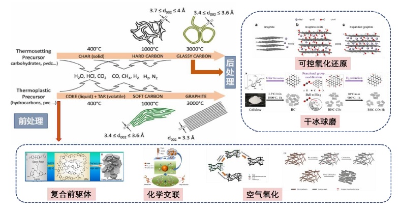 典型的碳材料均是sp2碳的多晶型物,層間通過弱的范德華力堆疊2D六角形共價晶格(石墨烯層)而形成分層結構。針對碳類負極材料的研發與優化,常以結構調控、改變表面化學性質等為主要手段。