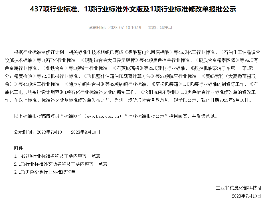 中國粉體網訊 近日,工信部發布消息,根據行業標準制修訂計劃,相關標準化技術組織已完成《鉛酸蓄電池用腐植酸》等46項化工行業標準、《石油化工油品調合設施技術標準》等5項石化行業標準、《現耐蝕合金大口徑無縫管》等44項黑色冶金行業標準、《硬質合金精磨圓棒》等96項有色金屬行業標準、《釓鐵合金》等5項稀土行業標準、《石英玻璃棉》等35項建材行業標準、《數控機油泵轉子車床 第1部分:精度檢驗》等92項機械行業標準、《飛機整體油箱油壓載荷計算方法》等27項航空行業標準、《麥綠素粉(大麥嫩苗提取粉)》等44項輕工行業標準、《隱點機織粘合襯》等42項紡織行業標準、《空投包裝箱》1項包裝行業標準的制修訂工作,《石油化工電加熱系統設計規范》1項石化行業標準外文版的編制工作,《含銅抗菌不銹鋼》1項黑色冶金行業標準修改單的修改工作。在以上標準、標準外文版及標準修改單發布之前,為進一步聽取社會各界意見,現予以公示,截止日期2023年8月10日。