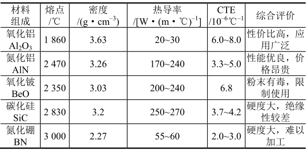 SiC單晶體具有很高的熱導率,純SiC單晶體室溫下的熱導率高達490W/(m·K),但由于晶粒取向的差異,多晶SiC陶瓷的熱導率只有67W/(m·K)。另外,SiC絕緣程度低,且介電損耗大,高頻特性差。因此,SiC作為電路基片材料,多年來一直研究得較少。