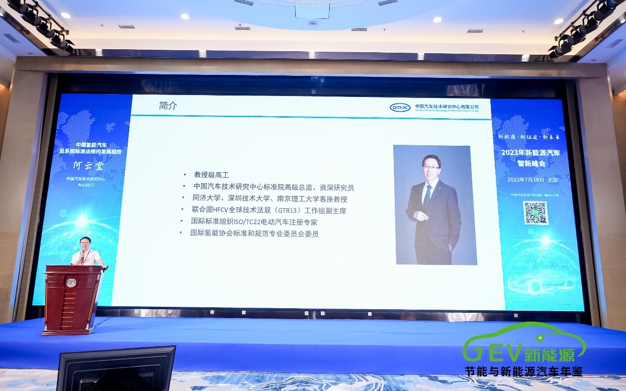 峰會現場,中國汽車技術研究中心有限公司標準院高級總監、資深研究員何云堂發表了《中國氫能汽車及系統標準法規的發展趨勢》主旨報告。該報告分享了中國燃料電池汽車標準和聯合國燃料電池汽車全球技術法規等內容,并對重點標準進行了解讀。