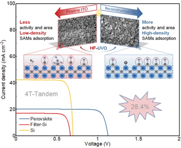 近期,中國科學(xué)院寧波材料技術(shù)與工程研究所研究員葉繼春帶領(lǐng)硅基太陽能及寬禁帶半導(dǎo)體團(tuán)隊(duì),在前期晶體硅和鈣鈦礦太陽電池研究的基礎(chǔ)上,在鈣鈦礦/硅疊層電池方向取得了新進(jìn)展。該團(tuán)隊(duì)提出了ITO表面重構(gòu)的新方法,實(shí)現(xiàn)了效率為28.4%的四端鈣鈦礦/硅疊層太陽電池的制備。該工作通過氫氟酸和隨后的紫外臭氧處理方法選擇性地去除ITO表面不需要的末端羥基和水解產(chǎn)物,從而實(shí)現(xiàn)ITO表面重構(gòu)。這種方法可增加ITO表面活性和面積,從而促進(jìn)高密度SAMs的吸附。此外,所得的氟化表面還可以防止ITO與鈣鈦礦活性層的直接接觸,并鈍化鈣鈦礦的埋底界面。得益于協(xié)同改進(jìn)的鈣鈦礦成膜、電荷提取、能級排列和界面化學(xué)穩(wěn)定性,相應(yīng)的單結(jié)鈣鈦礦太陽電池獲得了21.3%的光電轉(zhuǎn)換效率和較好的長期運(yùn)行穩(wěn)定性。科研人員將由重構(gòu)的ITO制得的半透明電池和遂穿氧鈍化接觸(TOPCon)電池用于四端鈣鈦礦/硅疊層太陽電池的制備,最終獲得了28.4%的效率。