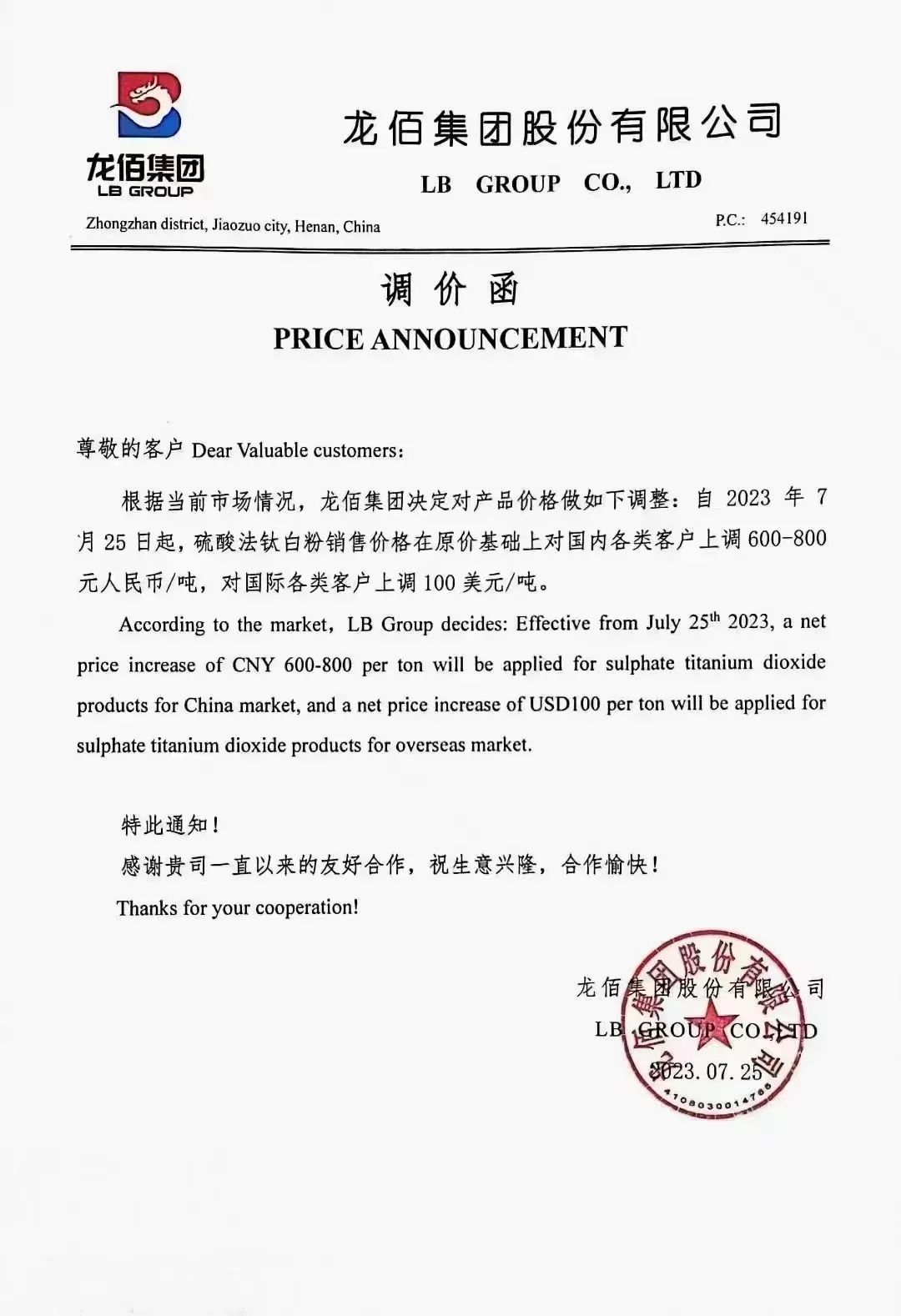 7月25日,龍佰集團(tuán)發(fā)布調(diào)價(jià)函,稱根據(jù)當(dāng)前市場情況,決定對(duì)產(chǎn)品價(jià)格做如下調(diào)整:自2023年7月25日起,硫酸法鈦白粉銷售價(jià)格在原價(jià)基礎(chǔ)上對(duì)國內(nèi)各類客戶上調(diào)600-800元人民幣/噸,對(duì)國際各類客戶上調(diào)100美元/噸。