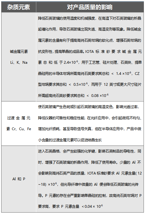 雜質元素對高純石英產品的質量影響很大,堿金屬、過渡金屬、Al及P等元素含量是高純石英原料的關鍵指標。雜質元素的含量要求根據制備的石英玻璃用途不同而不同,但總的趨勢是越低越好。