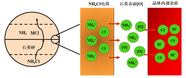 氯化焙燒是去除石英晶格雜質、堿金屬等間隙原子類雜質最主要的方法,氯化焙燒是在一定溫度和氛圍條件下,將雜質組分離子轉化為低沸點的氯化物,進而將雜質組分分離的過程。常用的氯化劑有氯氣、氯化氫、氯化銨、氯化鈉和氯化鈣等,氯化焙燒按產物形態可分為高溫焙燒(氯化揮發法)、中溫焙燒(氯化焙燒—浸出法)、氯化—離析。