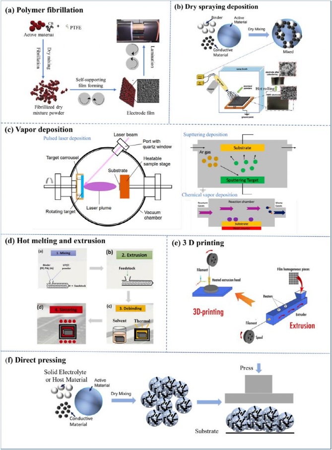 大多數(shù)SF工藝電極的制造程序包括三個(gè)步驟:干混、干涂層(干沉積)和最后的壓制,以達(dá)到所需的厚度和致密的電極結(jié)構(gòu)。也可以在干混后直接進(jìn)行壓制。根據(jù)干式涂層(沉積)過(guò)程的不同,SF工藝可以進(jìn)一步分為六種不同類型:聚合物纖維化、干噴沉積、氣相沉積、熱熔和擠壓、3D打印和直接壓制。圖1展示了每種工藝的示意圖。表1總結(jié)了這六種不同類型的優(yōu)缺點(diǎn)比較。