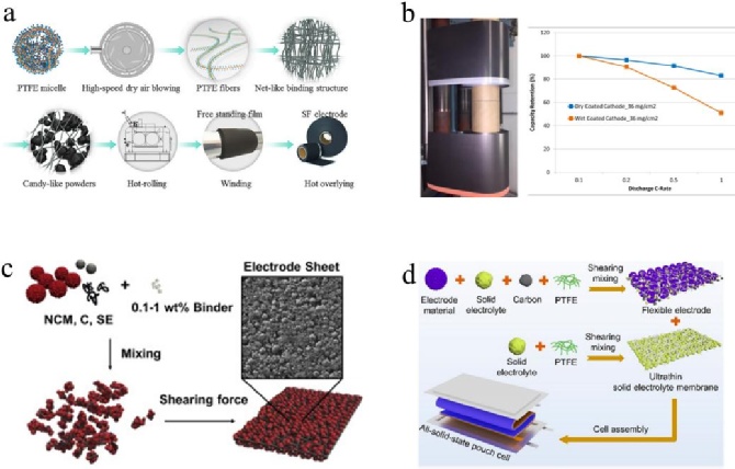 聚合物纖維化:Maxwell公司開發(fā)了一種用于超級(jí)電容器電極制造的創(chuàng)新聚合物纖維化技術(shù)。該技術(shù)利用可纖維化的聚四氟乙烯(PTFE)在高剪切力下形成纖維,將活性材料顆粒連接在一起,并通過(guò)熱壓形成自支撐的電極膜。這種技術(shù)可替代傳統(tǒng)的SC工藝,并與商業(yè)鋰電池生產(chǎn)設(shè)備兼容。Zhou等人成功地將這一技術(shù)擴(kuò)大到試驗(yàn)階段,用于制造磷酸鐵鋰(LFP)電極(圖2a)。陰極密度制造幾乎是SC電極的1.6倍。Zhang等人研究了基于PTFE的SF陽(yáng)極與不同碳材料的穩(wěn)定性。硬/軟碳陽(yáng)極表現(xiàn)出良好的循環(huán)壽命。Maxwell公司將基于PTFE的SF工藝擴(kuò)展到NMC和LIBs的石墨陽(yáng)極的制造(圖2b)。NMC/石墨電池在高負(fù)載的情況下表現(xiàn)出高倍率和良好的循環(huán)壽命。增加PTFE的纖維化程度是提高自承式電極膜機(jī)械強(qiáng)度的最有效方法之一。Zhong等人采用了不同的方法,如高溫、化學(xué)品和潤(rùn)滑來(lái)激活PTFE,以提高電極膜的機(jī)械強(qiáng)度。Hippauf等人將這種可擴(kuò)展的SF工藝用于全固態(tài)電池(ASSBs)的NMC電極制造(圖2c)。電池顯示出良好的循環(huán)穩(wěn)定性,在0.7 mA/cm2的電流下100次循環(huán)后,容量保持率為93.2%。用類似的方法,也制造出了具有代表性的固體電解質(zhì)膜,在室溫下顯示出低厚度和高離子傳導(dǎo)率(圖2d)。可擴(kuò)展性和兼容性使聚合物纖維化技術(shù)有希望取代目前的SC工藝。然而,可用粘結(jié)劑到目前為止只有PTFE。非常有必要為不同的電池系統(tǒng)開發(fā)具有廣泛電化學(xué)窗口的可纖維化粘結(jié)劑。