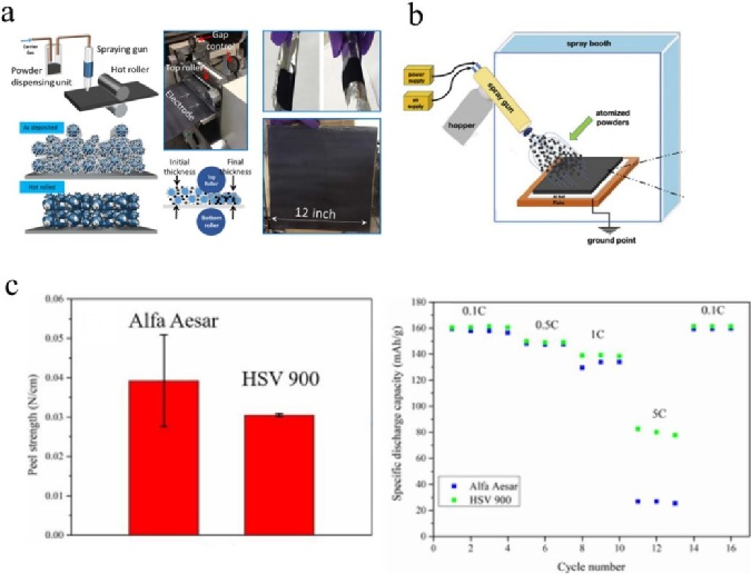 干噴沉積(DSD):Ludwig等人開發(fā)了一種將干噴沉積和熱軋相結(jié)合的方法,用于制造LCO電極(圖3a)。噴槍給帶電的干顆粒充電,帶電顆粒吸引到集流體上沉積,最終的電極通過(guò)熱軋工藝制造而成。這種方法具有良好的靈活性。由于其獨(dú)特的粘結(jié)劑分布,在機(jī)械強(qiáng)度和電化學(xué)性能方面略優(yōu)于傳統(tǒng)的電極。Al-Shroofy等人利用干噴沉積制造了NMC陰極(圖3b)。NMC、PVDF和碳黑進(jìn)行干混后,通過(guò)靜電噴槍噴灑到接地的鋁箔上,形成干式電極。PVDF的分子量的增加可以提高電極與鋁基材之間的剝離強(qiáng)度,同時(shí)較高分子量的PVDF制造的電極高倍率性能更好(圖3c)。DSD也可用于制造陽(yáng)極。Schälicke等人使用不同的氟熱塑料制造石墨陽(yáng)極,制造的石墨電極具有與傳統(tǒng)涂布制造的電極相媲美的電化學(xué)性能。DSD適用于各種常見(jiàn)活性材料顆粒。然而,該技術(shù)在大規(guī)模生產(chǎn)和控制電極厚度方面存在一些限制,且與當(dāng)前的鋰電池生產(chǎn)設(shè)備不兼容,其效率較低。目前對(duì)DSD的研究仍僅限于實(shí)驗(yàn)室。