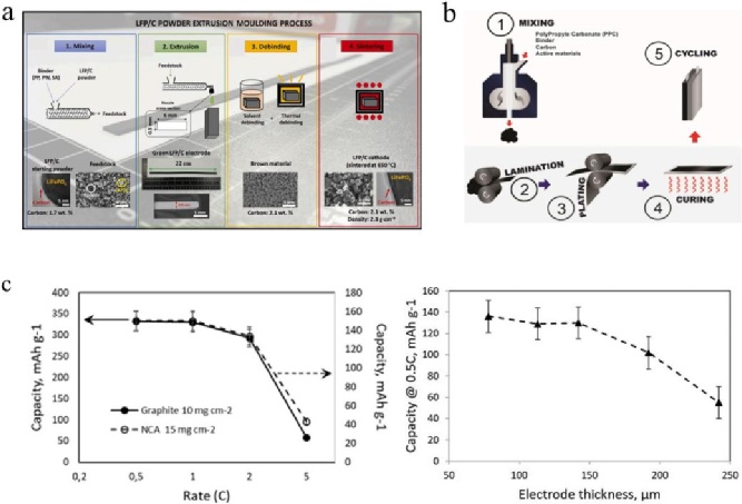 熱熔和擠壓:擠壓法通常需要較高的聚合物含量,這與電極制造不兼容。為解決這個(gè)問(wèn)題,已經(jīng)嘗試了包括添加溶劑和其他添加劑等多種方法。Sotomayor等人首次將擠壓法用作SF技術(shù),制造使用LTO和LFP等活性材料的電極。通過(guò)多次混合和熔融造粒將粘合劑與粉末混合,然后通過(guò)擠出機(jī)制備出各種厚度的極片。通過(guò)加熱將聚合物從電極上移走,產(chǎn)生內(nèi)部孔隙,擠壓法可以用于制造多孔電極。最后在高溫下燒結(jié)電極,使剩余顆粒之間形成內(nèi)聚力。減少粘合劑的使用對(duì)于進(jìn)一步應(yīng)用于實(shí)際電極制造非常重要。Torre-Gamarra等人采用類似的方法,使用相同的粘合劑系統(tǒng)制造了約500微米厚的無(wú)粘結(jié)自支撐LFP電極(圖4a)。Khakani等人報(bào)道了一種使用碳酸聚丙烯(PPC)和氫化丁腈橡膠(HNBR)作為粘合劑系統(tǒng)的SF擠壓的最新應(yīng)用(圖4b)。成功制造出了LFP、NMC111陰極和LTO陽(yáng)極,其活性材料負(fù)載率為77.5%。Astafyeva等人使用類似的方法,以PPC作為犧牲粘合劑,制造了活性材料負(fù)載率為90%的鎳鈷鋁氧化鋰(NCA)陰極和石墨陽(yáng)極(圖4c)。擠壓法對(duì)顆粒大小敏感,需要準(zhǔn)確控制溫度、剪切力和擠壓時(shí)間。此外,高消耗的聚合物、繁瑣的制造過(guò)程以及脫膠和燒結(jié)所需的高溫處理限制了它在實(shí)際電極中的應(yīng)用。