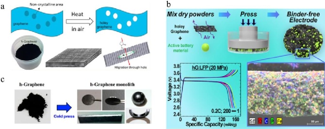 圖5. 基于可壓縮孔狀石墨烯的SF電極制造。(a) 孔狀石墨烯的合成及致密結(jié)構(gòu)的形成。(b) 借助可壓縮孔石墨烯,通過(guò)直接壓制制備LFP陰極。(c) 通過(guò)直接壓制制備不同形狀的石墨烯單片。