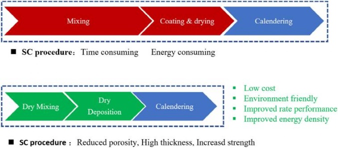 鋰離子電池(LIBs)的成本和性能在很大程度上取決于電極的制造工藝。目前商用鋰離子電池的電極制造通常采用slurry-casting (SC) procedure即濕法涂布工藝,這限制了電極的厚度。為了克服這個(gè)限制,solvent-free (SF) procedure即干法制造工藝是一種有希望的解決方案。SF工藝不使用溶劑,通過(guò)干法均化粘合劑與活性材料和導(dǎo)電劑,可以制造出厚電極而無(wú)需擔(dān)心粘合劑分布不均的問(wèn)題。增加電極厚度可以顯著提高能量密度,并降低制造成本。許多電池公司已經(jīng)在SF工藝電極制造方面進(jìn)行了研究,并有一些成功的商業(yè)應(yīng)用案例。然而,SF工藝在商業(yè)化中仍面臨技術(shù)和工程上的挑戰(zhàn)。需要解決技術(shù)和工程上的難題才能在工業(yè)化生產(chǎn)中廣泛應(yīng)用。