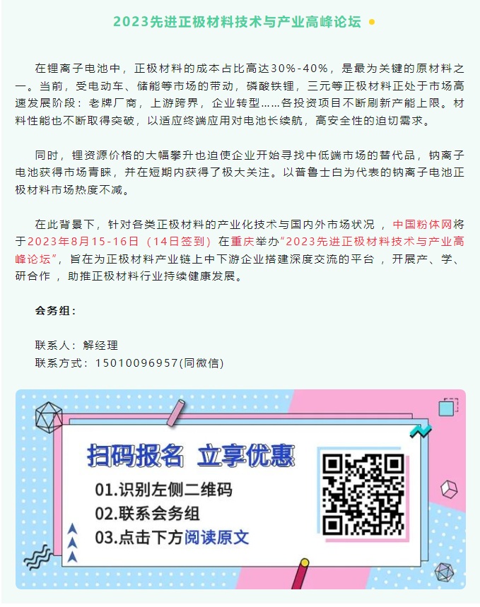 從2023先進正極材料技術與產業高峰論壇暨第一屆鈉離子電池材料技術研討會組委會獲悉,本屆會議將于2023年8月15-16日在重慶舉辦。萬華化學集團電池科技有限公司邀請您共同出席。