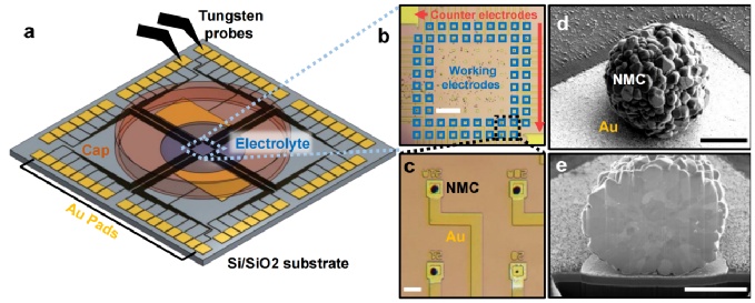 設(shè)計了一種多電極陣列,在2厘米長的硅基底上平版印刷的金微電極并在基底上覆蓋了500納米厚的絕緣二氧化硅熱氧化物(圖1a),多電極陣列由62個正方形微電極組成。工作電極由單個NMC532粒子組成(圖1b-d)。為了改善粒子與微電極之間的電氣和物理接觸,在400°C下對芯片進(jìn)行了1小時的退火處理。接著構(gòu)建了對/參比電極,兩個電極由部分脫鋰的Li0.6FePO4與PVDF和碳混合而成的漿液組成。對/參比電極的電化學(xué)極化可以忽略不計。很難對每個NMC粒子重量進(jìn)行精確測量,因此使用SEM投影面積來估計顆粒的體積。之后將陣列放置在手套箱中,滴入電解液,組成電池進(jìn)行測試。