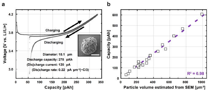 首先以0.22 pA μm-3的恒定電流對21個顆粒進(jìn)行了電循環(huán)。圖2a中顯示了一個代表性粒子的第一次充電/放電和第二次充電曲線;該顆粒的直徑為10.1微米,首次放電容量為278 pAh。繪制了測得的21個顆粒的電化學(xué)放電容量與根據(jù)掃描電鏡圖像估算的顆粒體積的對比圖(圖2b)。結(jié)果顯示,放電容量與體積成正比,這證實(shí)了單顆粒電化學(xué)和基于顯微鏡的體積估算的可靠性。本實(shí)驗(yàn)中涵蓋了二十個顆粒,遠(yuǎn)多于以前只研究一個或幾個顆粒的單顆粒電化學(xué)研究。這個較大的數(shù)據(jù)集對于從統(tǒng)計學(xué)角度揭示意想不到的機(jī)制至關(guān)重要。