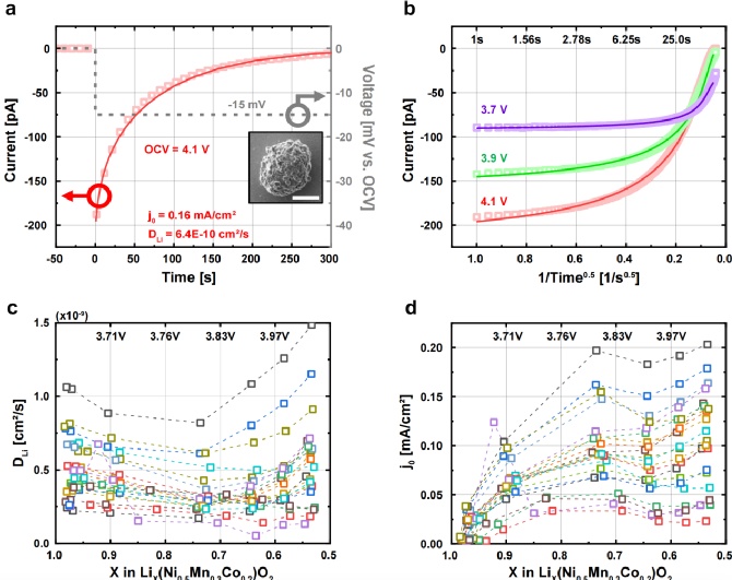 在公式(2)中,I代表電化學(xué)電流,t代表時間,B代表比奧數(shù),r代表粒子半徑,R代表氣體常數(shù),T代表溫度,Q代表PITT期間的綜合電化學(xué)電荷。公式(2)顯示了j0、DLi和B之間的關(guān)系。圖3b顯示了PITT電流響應(yīng)和3個不同目標(biāo)開路電位(OCV)時的擬合。通過在低過電位和鋰化過程中進(jìn)行PITT測量,可以使用公式(1,2)來得到DLi和j0的估計值。隨后,對所有的粒子進(jìn)行重復(fù)的PITT測量,并測量了粒子間DLi和j0的變化。所有電壓下的平均量化DLi和j0標(biāo)準(zhǔn)偏差分別為約1%和約3%,顯示測量結(jié)果具有可重復(fù)性。圖3c,d是21個粒子的j0和DLi與鋰分?jǐn)?shù)(X)的關(guān)系圖。