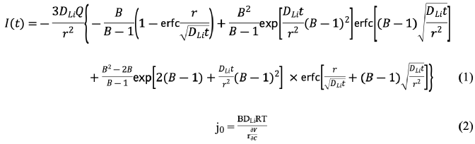 采用恒電位間歇滴定技術(shù)(PITT)來測量交換電流密度j0和鋰離子擴(kuò)散系數(shù)DLi。DLi描述了顆粒內(nèi)離子的擴(kuò)散速率,而j0用于描述反應(yīng)速率。為獲得電化學(xué)參數(shù) DLi 和 j0,將方程 (1-2) 與 PITT 電流軌跡進(jìn)行擬合。