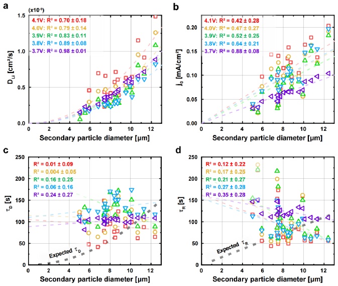 接下來繪制了j0和DLi與二次粒子直徑的函數(shù)關(guān)系圖(圖 4a,b)。根據(jù)定義,j0和DLi都是與尺寸無關(guān)的強(qiáng)度屬性。然而,出乎意料的是,j0和DLi似乎都會隨著顆粒尺寸的增大而增大。DLi似乎與二次粒子直徑成二次方比例,j0似乎與直徑成線性比例。顆粒直徑之間存在顯著的統(tǒng)計學(xué)相關(guān)性。擴(kuò)散時間用𝜏𝐷=l2/4DLi來定義,其中l(wèi)是特征擴(kuò)散長度,假定等于次級粒子的半徑。根據(jù)DLi恒定的標(biāo)準(zhǔn)假設(shè),擴(kuò)散時間𝜏𝐷預(yù)計會隨著粒子直徑的增大而二次方增加。然而,本實(shí)驗(yàn)𝜏𝐷與顆粒大小基本無關(guān)(圖4c)。對反應(yīng)時間進(jìn)行同樣的分析,特征時間常數(shù)𝜏𝑅 = 𝑅𝑒𝑠 × 𝐶𝑎𝑝。𝐶𝑎𝑝是每伏特傳輸?shù)姆ɡ陔姾桑c粒子的體積成比例。𝑅𝑒𝑠是電荷轉(zhuǎn)移電阻。根據(jù) j0與尺寸無關(guān)的假設(shè),𝜏𝑅應(yīng)該與顆粒的直徑成正比。然而,圖 4b 中的結(jié)果表明,交換電流密度 j0 隨顆粒大小的增加而增加,因此𝜏𝑅與顆粒大小無關(guān)。