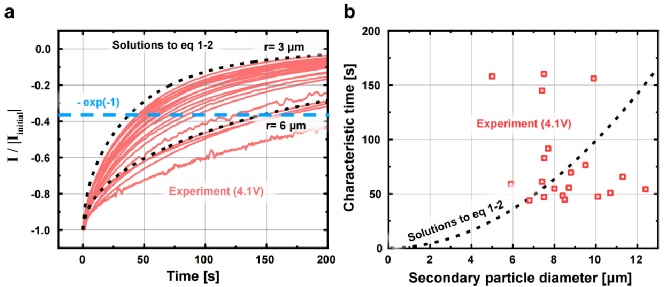 粒子尺寸與𝜏𝐷(擴(kuò)散時間)和𝜏𝑅(反應(yīng)時間)之間缺乏預(yù)期相關(guān)性并非我們擬合過程的誤差。在圖5a中,繪制了所有粒子的電流軌跡I,并在4.1V進(jìn)行PITT實(shí)驗(yàn)后0.1秒獲得的初始電流Iinit進(jìn)行了歸一化處理。圖5b繪制了特征時間,即電流衰減到初始電流的37%或[exp(-1)]時的時間,再次顯示與粒子大小無關(guān)。方程(1-2)表明,在j0和DLi不變的情況下,該特征時間隨著粒子直徑的增加而增加。這一結(jié)果證實(shí),原始電流軌跡中沒有與粒徑相關(guān)的𝜏𝐷,這是直接觀察到的,而不是擬合的假象。總體而言,所有這些𝜏𝑅(反應(yīng)時間)與粒子尺寸相關(guān)的電化學(xué)參數(shù)以及𝜏𝐷(擴(kuò)散時間)與尺寸無關(guān)的觀察結(jié)果都與我們對離子嵌入電池材料的標(biāo)準(zhǔn)理解形成鮮明對比。