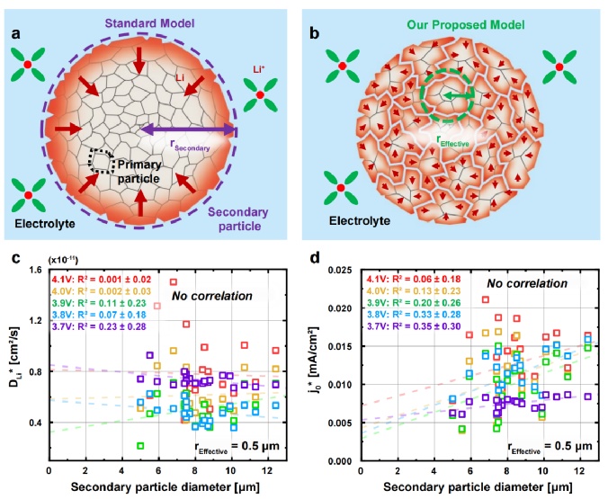 本研究旨在探究j0和DLi是否與次級粒子的大小有關(guān)(圖4a,b),以及反應(yīng)時間和擴(kuò)散時間是否與次級粒子的大小無關(guān)(圖4c,d)。j0和DLi的明顯尺寸依賴性是由于鋰在電池顆粒中傳輸?shù)臉?biāo)準(zhǔn)觀點(diǎn)不正確。標(biāo)準(zhǔn)觀點(diǎn)認(rèn)為鋰進(jìn)入次級粒子表面并擴(kuò)散到粒子內(nèi)部。然而,作者的研究結(jié)果表明,擴(kuò)散時間與粒子大小無關(guān)(圖4c),這與標(biāo)準(zhǔn)觀點(diǎn)不符(圖6a)。