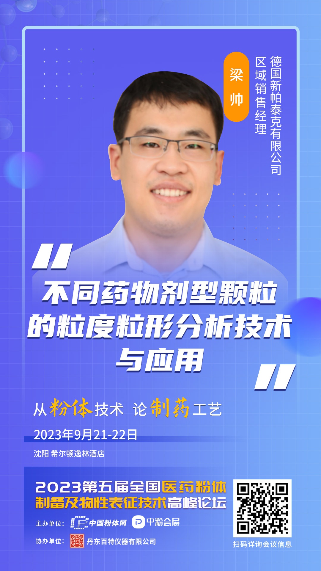 2023年9月21-22日,中國粉體網以“從粉體技術,論制藥工藝”為主題,將在遼寧沈陽希爾頓逸林酒店舉辦“第五屆全國醫藥粉體制備及物性表征技術高峰論壇”,屆時將邀請來自德國新帕泰克有限公司的銷售經理梁帥先生作《不同藥物劑型顆粒的粒度粒形分析技術與應用》報告,現場報告中,報告主講人將列舉實際應用案例,分享不同藥物的粒度粒形解決方案。