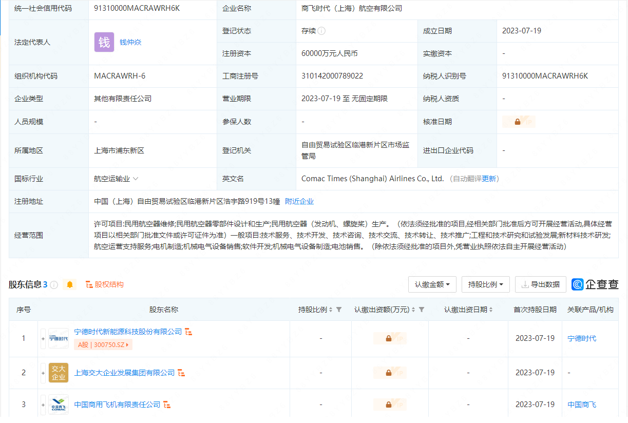 7月19日,商飛時代(上海)航空有限公司成立,經(jīng)營范圍包含民用航空器維修、民用航空器零部件設計和生產(chǎn)、民用航空器(發(fā)動機、螺旋槳)生產(chǎn)等。該公司由寧德時代新能源科技股份有限公司、中國商用飛機有限責任公司、上海交大企業(yè)發(fā)展集團有限公司共同持股。
