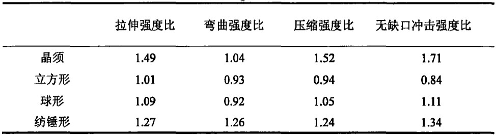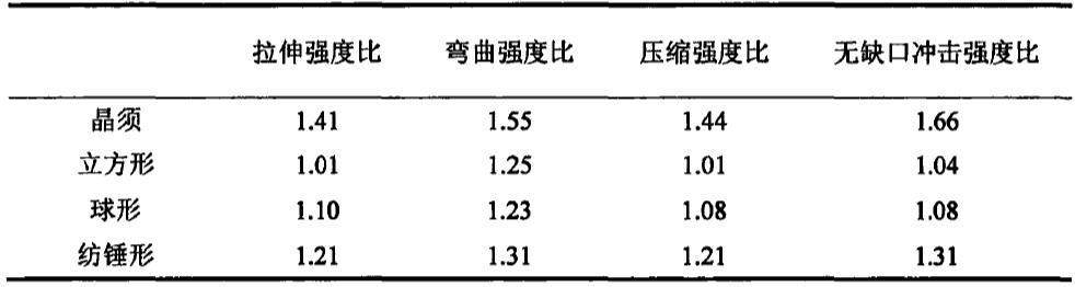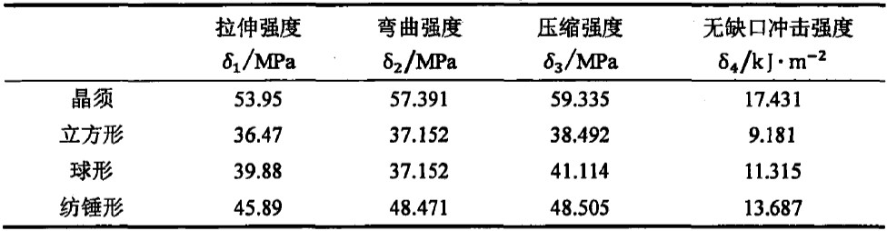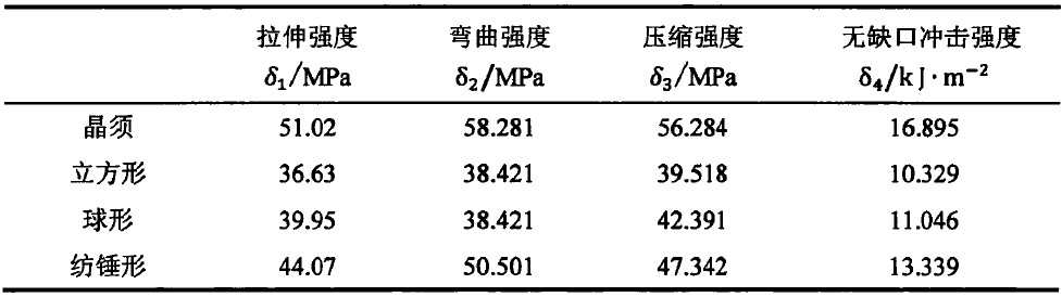 在最佳添加量的條件下,環氧樹脂體系中添加碳酸鈣晶須的效果最好,紡錘形、球形次之,最后是立方形碳酸鈣。