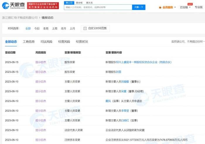 近日,據(jù)天眼查App顯示,浙江德匯電子陶瓷有限公司(簡稱德匯陶瓷)發(fā)生工商變更,新增北京小米智造股權(quán)投資基金合伙企業(yè)(有限合伙)等為股東,此外,公司法定代表人由邱強(qiáng)變更為吳震,注冊資本由約5021.58萬人民幣增至約7476.57萬人民幣。