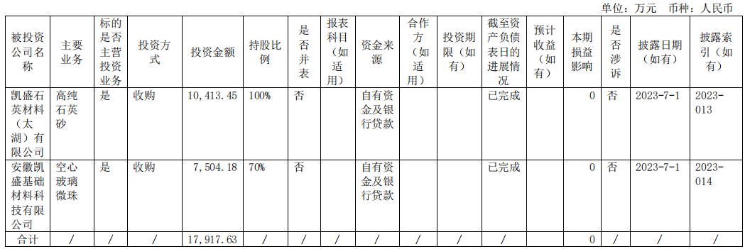 2023年上半年,凱盛科技實現營收27.06億元,歸母凈利潤7406.22萬元。上半年,凱盛科技完成太湖石英100%股權、凱盛基材70%股權的收購工作。其中太湖石英年產5000噸高純石英砂項目目前正處于發展戰略機遇期,市場前景廣闊,與公司合成法制備的高純石英砂可形成緊密的產業聯動。