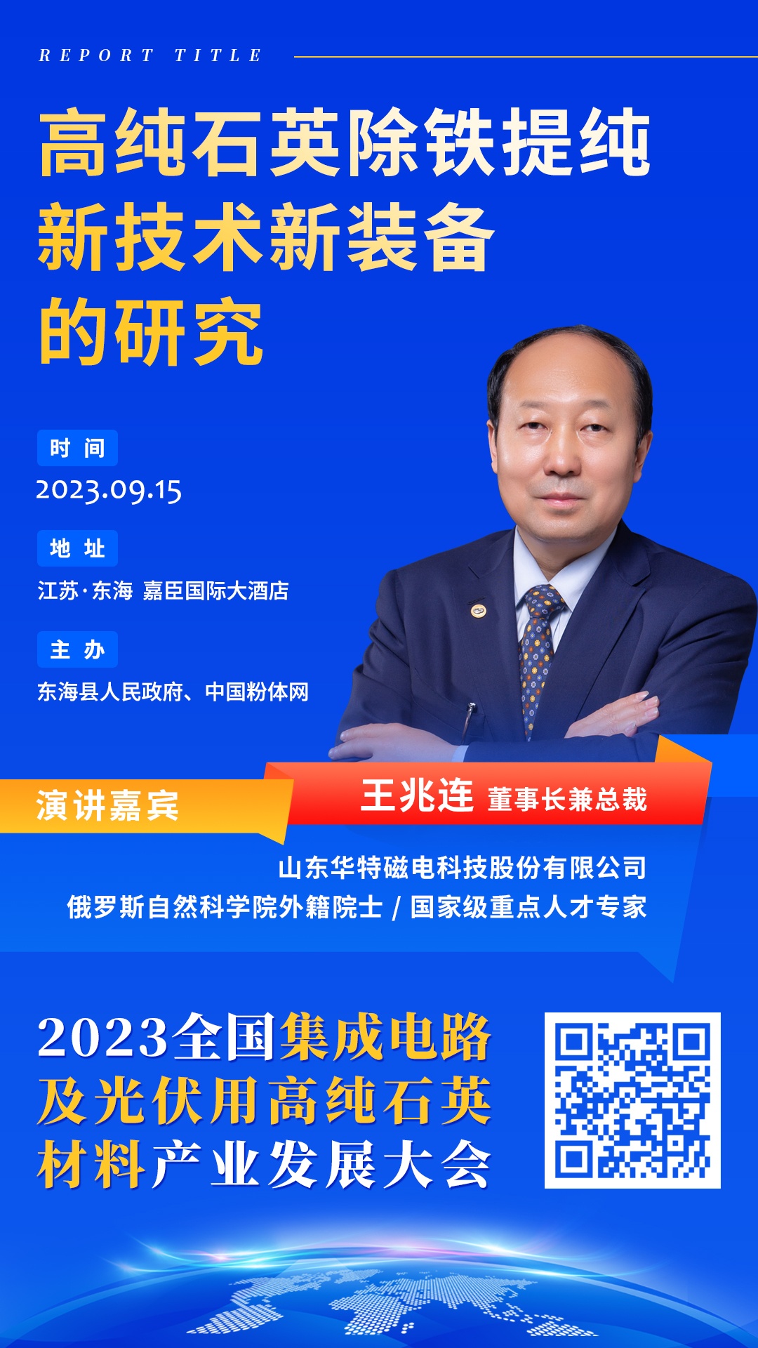 2023年9月15日,中國粉體網將在江蘇東海舉辦“2023全國集成電路及光伏用高純石英材料產業發展大會”。屆時,山東華特磁電科技股份有限公司董事長兼總裁王兆連將帶來題為《高純石英除鐵提純新技術新裝備的研究》的報告,華特磁電在磁選裝備領域深耕30年,有著豐富的選礦經驗。屆時,王董將為我們介紹哪些新的除鐵工藝和裝備呢?讓我們拭目以待。